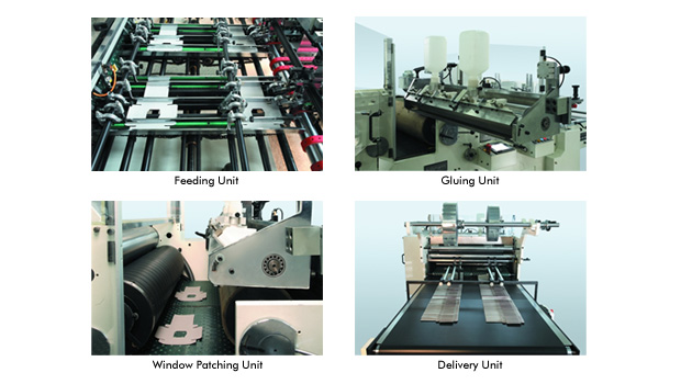 • The boxes are fed to window sticking unit from gluing unit by the air suction table which is running individually and helps sensor checking. If there is no sheet, air suction table goes down immediately to avoid from the glue