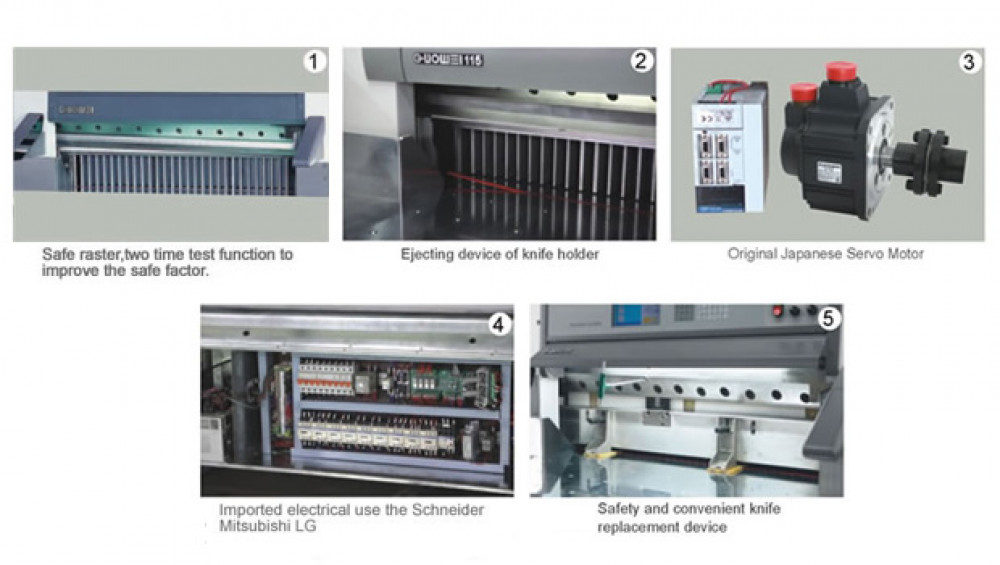 This model adopts Japan AC digit servo control system,10.4 inches colorful liquid crystal display screen of resolution rate is 0.01mm, has self-diagnostic function of troubles and displays the operating pattern, It has 100 program units, more than 10000 different cutting position, dynamic cutting display , running situation, dynamic follow-up. The max paper-pushing speed is 5-18m/min, it adopts stronger computer operating system. It can memorize store the storage time can be up to 300000 hours above. It has self maintenance to the operating system. Adopt Italy hydraulic components, Germany Japan and Korea electric components. Taiwan ball lead screw and linear guide-rail are used. PLC controller can monitor all the electrical and mechanical section. Its key parts adopt imported bearing of low maintenance.