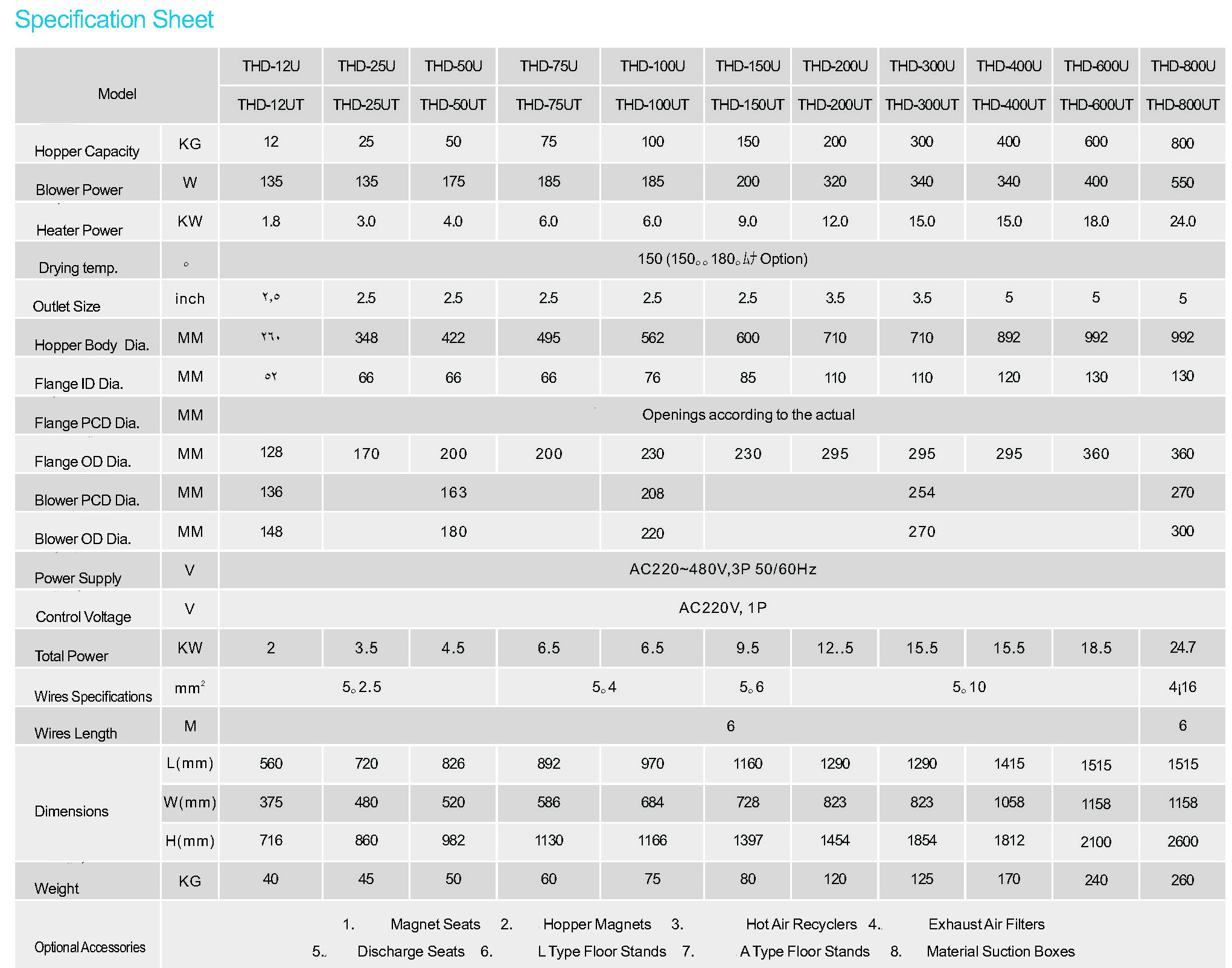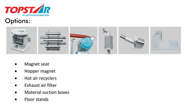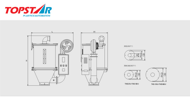 Hopper Dryers are mainly applied to plastic material drying. Hot air is used to dry all wet materials which gain an even hot air flow to improve drying efficiency for assuring quality of products. Hopper capacities rang from 12kgs -1000kgs can be offered for selection. Exhaust air filter (option) can filter the dust-contain air effectively from discharging to the surrounding area. Hot air recyclers (option) to make hot air form a semi-closed circulated loop to speed up hot air circulation for shorten heating time to achieve energy saving up to 30%.