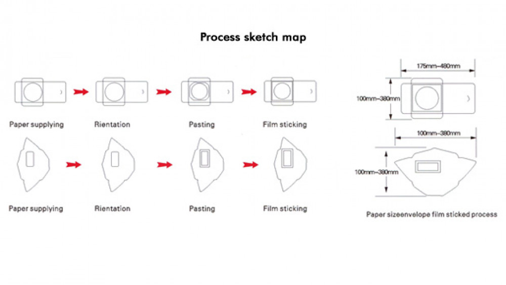 Air suction bottom paper extraction separates papers reliably, and can be fed with paper continuously. Forcibly positioning and automatic wheel rolling gumming ensures the even glue amount. Film is adjusted by CVT, which is convenient and reliable.