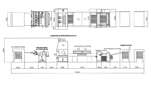 This is a machine designed especially for the P.P film laminating of thick paper. It’s can be used for fully laminating and when its system switch to window type of thick paper, its will pumping the glue and apply on the surface of the sheet and transported through conveyor to the IR curing system for the dry process. The upper roller will heat up by water temperature controller to pressurized each laminated sheet with press roller. Then through the cutting system its unique twin-disc knife to cut a required gap then tear it up by pulling roller and transport sheet forward to stacker automatically.